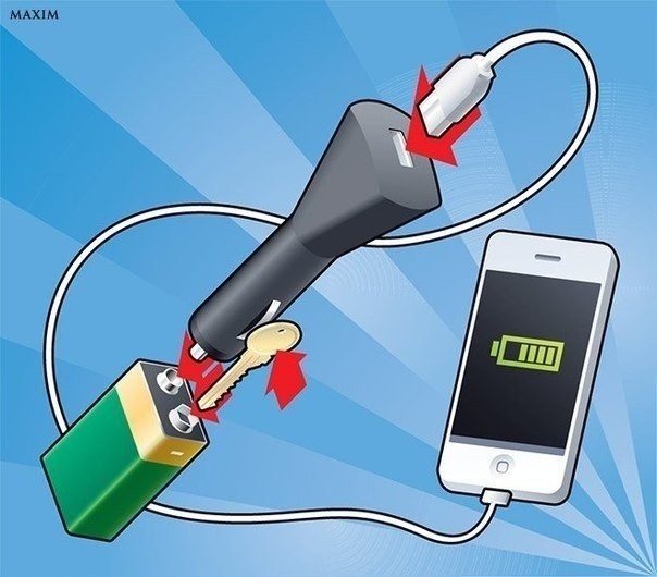 Зарядить телефон можно с помощью 9-вольтовой «кроны» и обычного ключа!