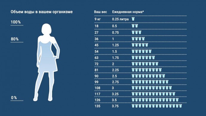 Формула для расчёта суточной нормы воды Сколько воды нужно пить ежедневно, можно рассчитать по простой формуле. Рекомендуемая норма жидкости для взрослого человека составляет 30–35 мл на 1 кг массы тела. Таким образом, для человека весом 70 кг оптимальный объём составит 2,1–2,5 литра в сутки. В этот объём включается не только чистая вода, но и жидкость, получаемая из пищи: супов, овощей и фруктов. В яде ситуаций норму необходимо увеличивать. При физической активности, жаркой погоде, лихорадке, д...