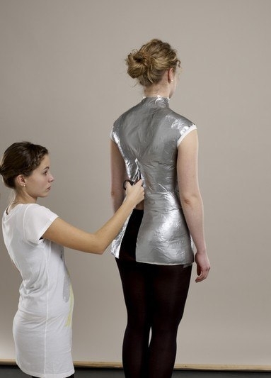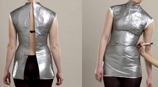 Сначала выполним аналогичные действия, тело обмотаем пленкой и скотчем, конечно, поверх старой футболки.
