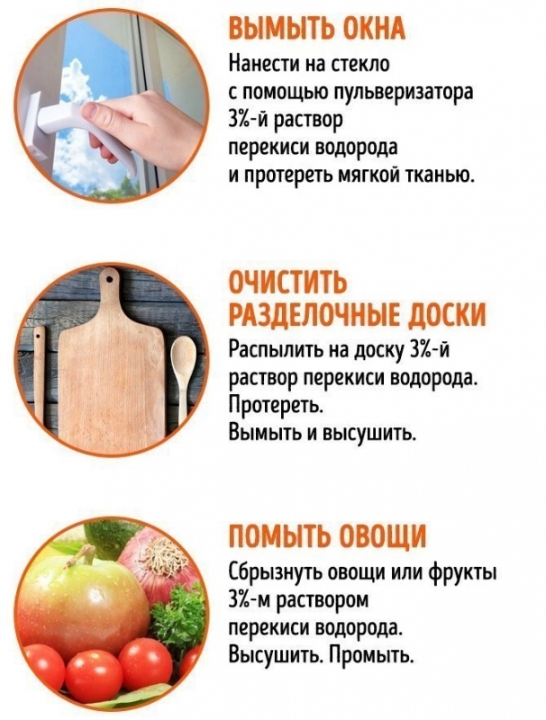 Перекись водорода на кухне 1. Перекись прекрасно справится с дезинфекцией разделочных досок и других поверхностей, уничтожит вредоносные микробы – сальмонеллы и кока-бактерии. 2...