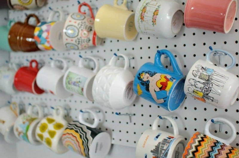 Яркие чашки выглядят весьма оригинально на белом пегборде. В то же время, комплект белых кружек можно разместить на яркой доске.