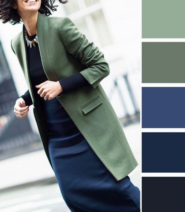 Серо-синий и нежный зелёный — неяркое сочетание, которое может выглядеть стильно и прекрасно подходит для людей с не контрастной внешностью. Бежевые, чёрные и белые оттенки дополняют эту палитру и делают её ещё более изысканной.