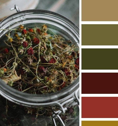 Оливковый и красно-оранжевый — тёплое и сказочное сочетание, которое можно использовать как акцентное.
