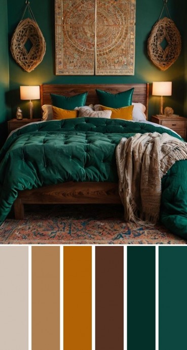 Тёмно-изумрудный и жёлто-оранжевый оттенки — это глубокая и яркая палитра, динамичная и тонизирующая.
