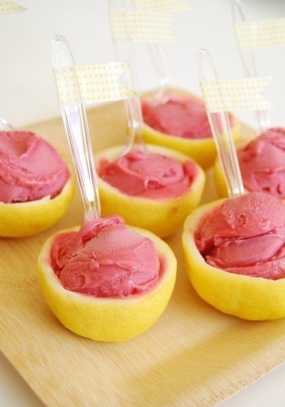 Разрежьте пополам лимон и уберите мякоть. в получившиеся чашечки выложите шарики мороженого. также вместо лимона можно использовать апельсин или грейпфрут.
