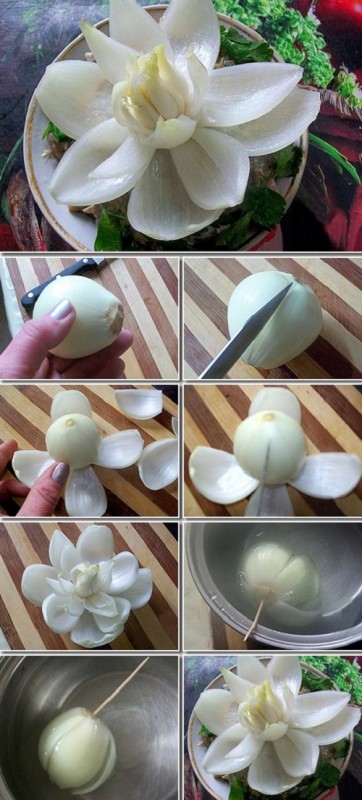 В период новогодних праздников мы традиционно собираем самых близких людей за большим столом с множеством разных блюд. И хочется добавить этим блюдам какую-то изюминку, чтобы они стали не только вкусным угощением, но еще и украшением стола. У нас есть для вас 10 идей, с которыми из простых овощей вы сможете сделать красивые цветы и украсить ими свои гастрономические шедевры.