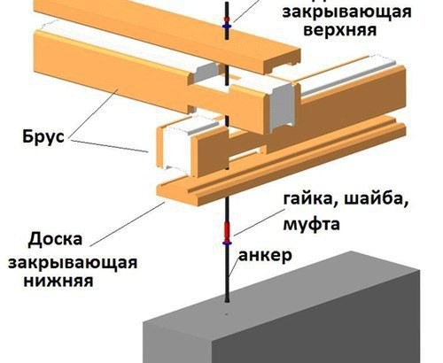 Крепление обвязки к фундаментам При фундаменте дома из бетона или кирпича используют анкерное закрепление. На стадии возведения фундаментов в них предусматривают анкерные болты диаметром 12-16 мм. Длина подбирается так, чтобы обеспечить достаточное крепление обвязочного бруса. Он должен входить в древесину не менее чем на 8-10 см, но лучше предусмотреть сквозное закрепление. К сваям брус крепиться насквозь с помощью болтов диаметром не менее 12 мм. В качестве второго варианта крепежных элементов можно использовать металлические шпильки такого же сечения. Крепления рекомендуется обработать защитными составами для предотвращения появления коррозии.