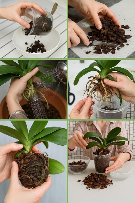Пересаживаем орхидею, семь шагов Шаг один Достаньте орхидею из горшка и положите её в широкий таз. Чтобы вам легче было вытащить орхидею, помните слегка стенки горшка. Если это не поможет – аккуратно, чтобы не повредить воздушные корни фаленопсиса, разрежьте или разбейте старый горшок. Обычно, чем сильнее развита корневая у фаленопсиса, тем крепче она «держится» за горшок, и тем труднее её освободить. Однако если орхидея ослаблена или больна, у неё мало живых корней, то она легко выходит из горшка, до...