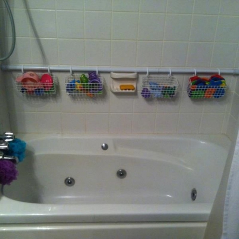 • Повесьте две перекладины для занавески в душе – одну использовать по прямому назначению, вторую – для поддерживания корзиночек для мелочей. Важно, чтобы корзинки были пластмассовые и с дырочками, чтобы стекала вода.