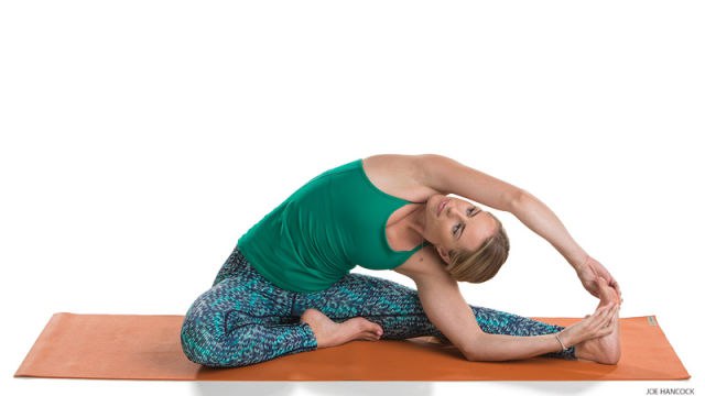 Выпрямите левую ногу, а правую возьмите за стопу и притяните её к промежности. Разверните корпус к согнутой ноге. Захватите левой рукой голень и постарайтесь опустить левый бок на ногу. Следите, чтобы бёдра были плотно прижаты к полу. Со вдохом поднимите правую руку высоко вверх, активно стремясь к потолку. На выдохе опустите её на левую ногу.