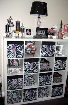 Можно организовать «бюро» самостоятельно, оборудовав обычный открытый комод множеством контейнеров одинаковой формы и размера.