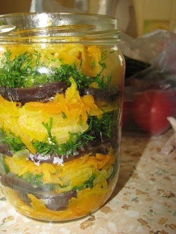 И так поочередно до верха банки - морковь-лук - баклажаны - зелень с чесноком.