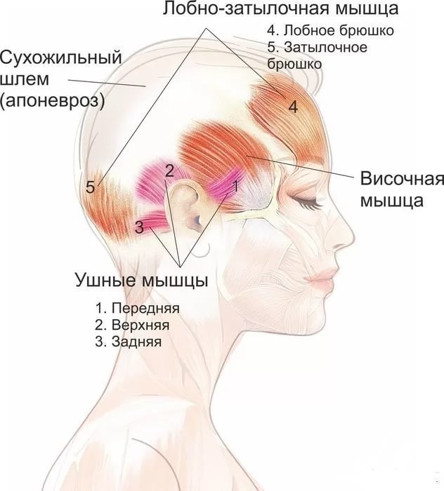 Мысленно потяните все мышцы свода черепа в направлении макушки. Почувствуйте, как смещается вверх лобное и затылочное брюшки надчерепной мышцы, как сокращается сухожильный шлем (апоневроз), как стремится вверх височная мышца, тянутся вверх и назад ушные мышцы, напрягается и тянется к макушке затылочное брюшко, увлекая за собой мышцы задней поверхности шеи. Представьте вязаную шапочку-шлем, которая мягко, но плотно охватывает голову и, словно давая усадку прямо на голове, тянет ткани наверх. «Натяните шлем», почувствовав натяжение всех мышц к самой высокой точке черепа: