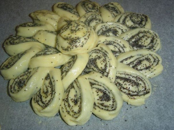 Теперь начинаем формировать пирог, для этого один лепесток поворачиваем внутрь, а два следующих оставляя снаружи, повернув набок.