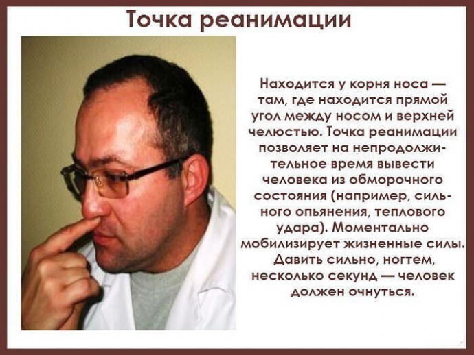 Находится у корня носа — там, где находится прямой угол между носом и верхней челюстью. Точка реанимации позволяет на непродолжительное время вывести человека из обморочного состояния (например, сильного опьянения, теплового удара). Моментально мобилизирует жизненные силы. Давить сильно, ногтем, несколько секунд — человек должен очнуться.