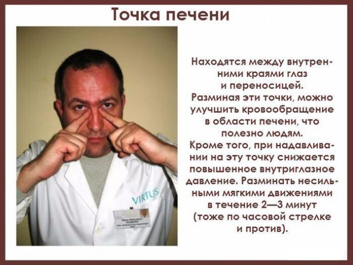 Находятся на передневерхних поверхностях глазных яблок. Позволяет успокоить сердечный ритм, если возникло сердцебиение и снизить артериальное давление, если оно повышено. Перед массажем надо закрыть глаза и «смотреть» вниз. Давить надо аккуратно, несильно, не дольше 20-30 секунд (если дольше, можно потерять сознание).