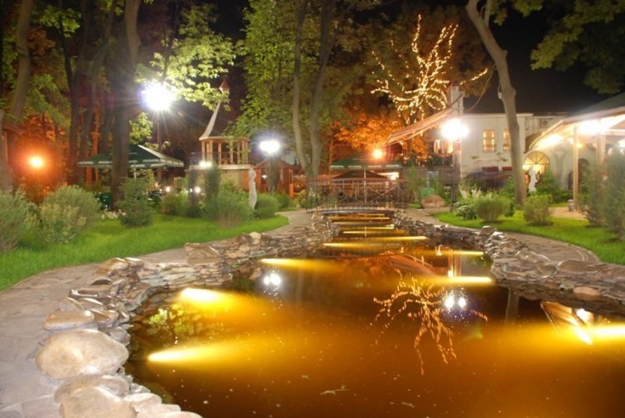 Подводные светильники могут быть как обычными (желтоватыми), так и светодиодными. Вторые могут иметь различный цвет и даже менять его, переливаясь всеми цветами радуги. Да и свет обычных фонариков по берегам, отражаясь от воды, будет играть и мерцать не хуже подсветки. Релаксирующий эффект обеспечен.