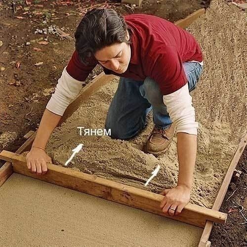 Перед укладкой песок нужно очень хорошо намочить водой.Песчаный подложечный слой выравнивается, как показано на фотографии. Для лучшего уплотнения нужно не просто разглаживать песок, вытягивая излишки на себя, но сперва продавливать произвольно насыпанный песок правилом, а потом разравнивать, вытягивая правило на себя.