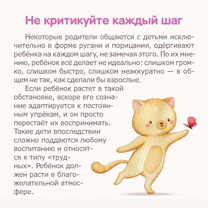 Подсказки-советы направлены на то, чтобы выявить разрушительные воспитательные приёмы, отказаться от них и вооружиться позитивными подходами, которые помогут сохранить во взаимоотношениях «ребёнок — взрослый» искренность и доверие.