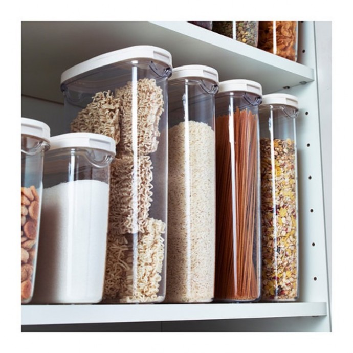 На контейнеры не должен падать прямой солнечный свет. Негативно отразится на сохранность сухих сыпучих продуктов близкое расположение раковины и плиты к запасам. Проследите, чтобы большинство контейнеров были на уровне глаз и хранились на полке средней высоты. Размеры ёмкостей желательно должны быть идентичны. Важно периодически проверять на наличие странного запаха и отсутствие в крупе насекомых.