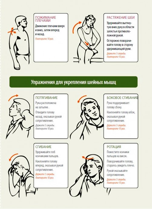 - упражнения вверх-вниз, влево-вправо головой, круговые повороты головы. Кто никогда не делал это упражнение, начинать с трех раз, постепенно и длительное время увеличивая количество этих упражнений.