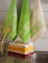 Не покупай для кухни махровые полотенца, так как они быстро загрязняются и выглядят неопрятно, к тому же долго сохнут. Выбирай льняные и хлопковые вафельные полотенца, ведь они хорошо отстирываются и долго сохраняют приличный вид.