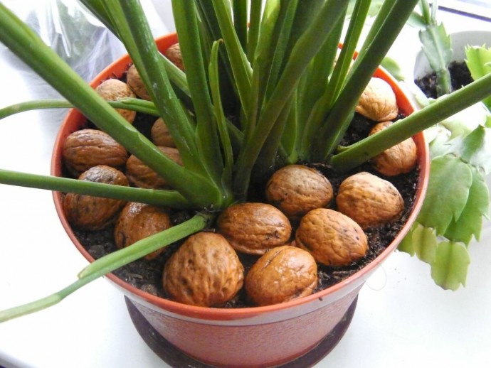 На грунте в горшке с растениями довольно часто можно заметить половинки скорлупы грецких орехов.
