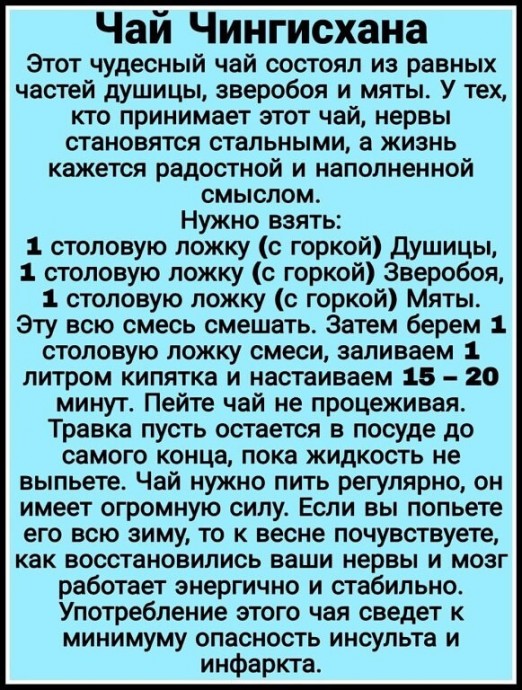 Как известно Чингисхан со своим войском завоевал практически половину мира. Длительные и утомительные переходы наряду с яростными сражениями,конечно, изматывали воинов хана. Как же им удавалось сохранять силы и нервное равновесие? Оказывается, Чингисхан приказывал своей орде пить специальный чай, который помогал сохранять здоровье и внутреннее спокойствие воинов.