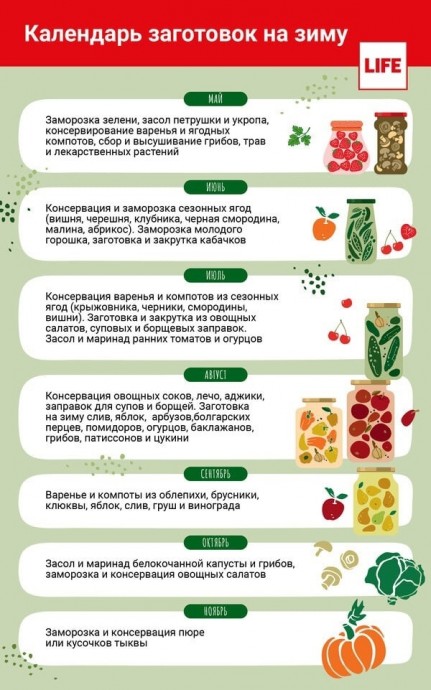 Особую роль в сохранении вкусовых качеств и полезных веществ в овощах, фруктах и зелени играет не только способ заготовки на зиму, но и период, когда она была совершена. Поэтому очень удобно иметь при себе календарь заготовок на зиму, чтобы точно знать, когда и какой овощ или фрукт пора готовить к сезону холодов.