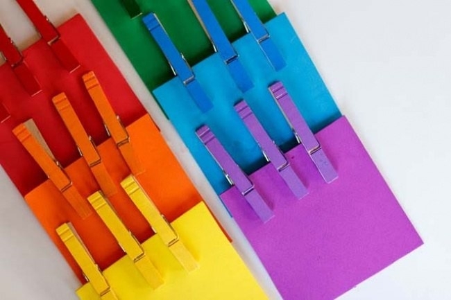 Возьмите цветной картон и вырежьте квадратики (8×8 см). Также купите деревянные прищепки и покрасьте их гуашью в те же цвета, что и картон. Теперь просто покажите вашему малышу, как соотносить цвет прищепки с цветом квадратов.