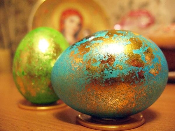Модная тенденция — мраморная окраска. Чтобы получить такой эффект, нужно обернуть яйцо материей, вложив в нее мелкие листочки газеты или тетради, и плотно закрутить. Покрасив яйца в интенсивном растворе, не разворачивая, переложите их в раствор менее интенсивной окраски или другой краситель (например, красная капуста или крапива).