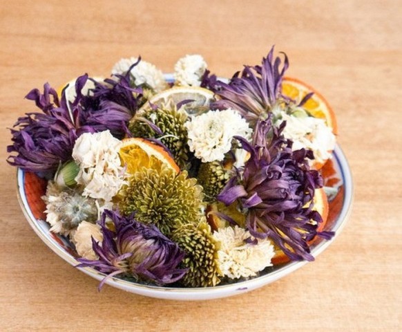 Отличный способ проявить вкус и фантазию, а заодно освежить квартиру без навязчивых запахов аэрозоля. Смешивайте бутоны и лепестки разного размера, цвета и текстуры. И не бойтесь добавить немного пряной травы (к примеру, несколько листиков мяты) или пару капель гармонирующего эфирного масла.