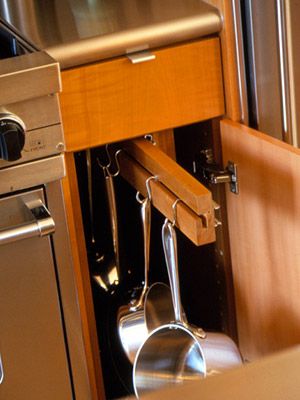 Но для кухни с современным дизайном это не всегда уместно. И тогда дизайнерская мысль предлагает спрятать их, например, в угловой шкафчик… со встроенными держателями для сковородок – подвесил и хорошо, внизу еще местечко для кастрюлек осталось.