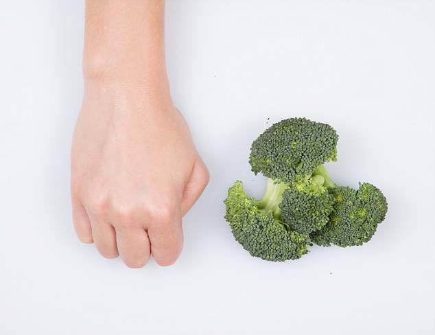 Одна из пяти порций овощей (80 грамм) в день должна быть хотя бы размером с ваш кулак. Важно также стремиться к разнообразию овощей в рационе и съедать овощи разных цветов. Овощи должны занимать половину вашей тарелки.