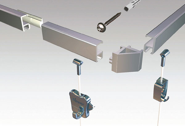 В художественных галереях часто применяют этот способ размещения картин. В домашних условиях на сам потолок или на границу его соединения со стеной прикрепляют рельсы с помощью специальных кронштейнов. Красиво смотрится и потолочный карниз. Сюда вдевается мелкий крючок, на который подвешивается прозрачная леска или другая крепежная веревка. Метод удобен тем, что можно картины двигать вдоль стены и регулировать высоту их размещения.