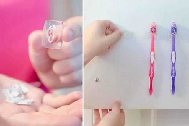 Если перевернуть на бок пару крючков и приклеить их на одном уровне в ванной (например на дверку шкафчика) , то их можно использовать как держатели зубных щеток.