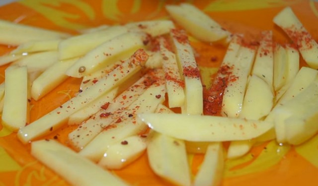 Нет посуды для приготовления картофеля фри? Не беда. Есть микроволновка, которая на раз-два справится с лакомством. Нарежьте картофель брусочками и просушите их на бумажных полотенцах 3-5 минут. Переложите картофель в тарелку, полейте обильно маслом, посыпьте специями и пряностями и поставьте в СВЧ печь до готовности (10-15 минут). Ешьте, пока хрустящий.