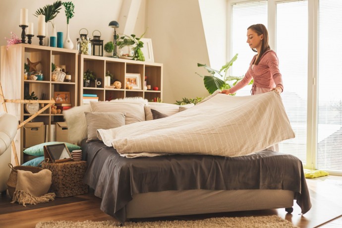 Порядок уборки спальни Чтобы вам не пришлось делать двойную работу и несколько раз вытирать пыль, убираемся по схеме из нескольких шагов всего за 15 минут: 1. Убираем разбросанные вещи по местам, а мусор бросаем в ведро. 2. Меняем постельное белье, если это требуется. 3. Пылесосим всю площадь комнаты, не забывая об углах, мягкой мебели и шторах. 4. Вытираем пыль и моем пол. Все — ваша спальня чистая